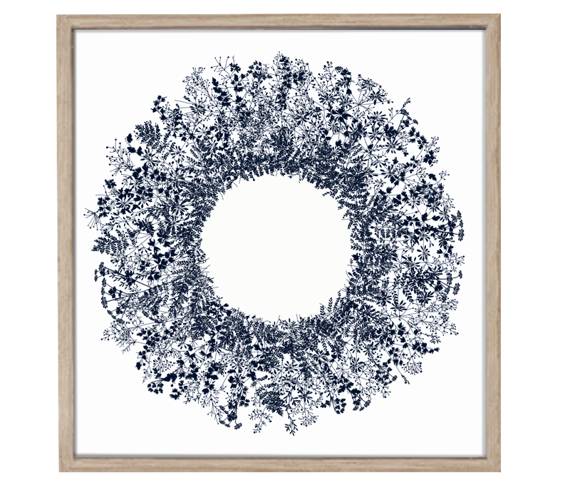 Mørkeblå illustration af krans af strå og blomster.Indrammet i en 30x30 cm træramme.