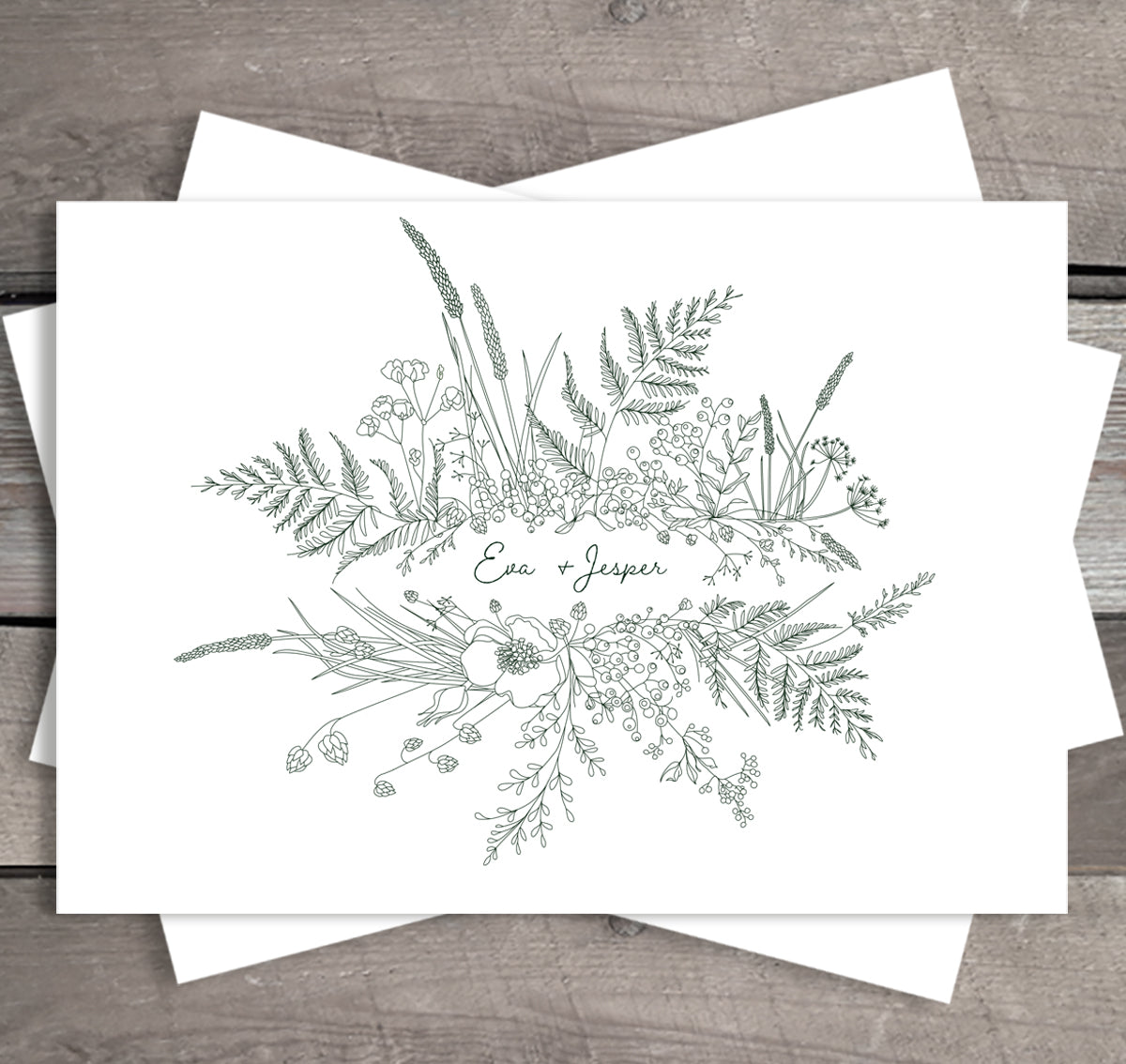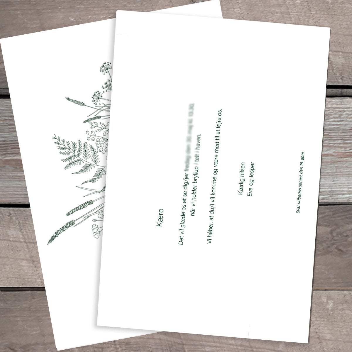 Invitationerne er str. A5 (210x148 mm), 2-sidet og produceres i 300 gr. råhvidt kvalitetspapir.