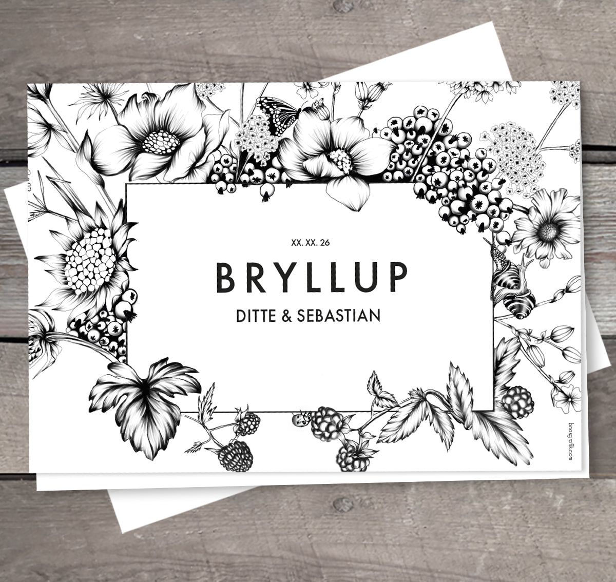 Invitationen er i str. A5 (210x148 mm), 2-sidet, på 300 gr. råhvidt kvalitetspapir.