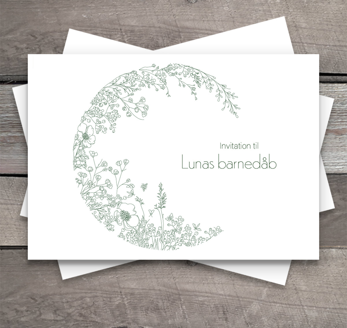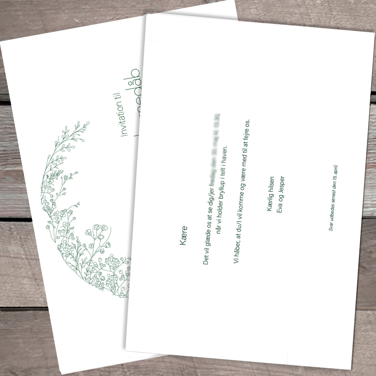 Invitationerne er str. A5 (210x148 mm), 2-sidet og produceres i 300 gr. råhvidt kvalitetspapir.
