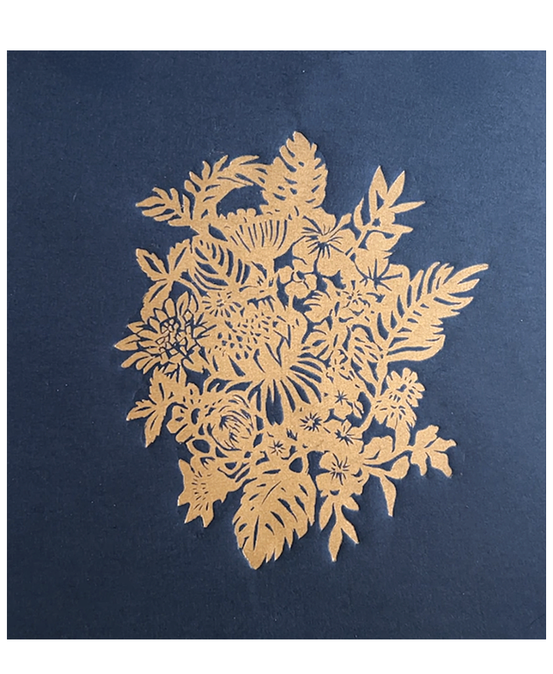Unika linoleumstryk af blomster. Ca. 24x27 cmPapiret er indigo blå japansk papir med guld motiv Serien er trykt i 8 eksemplarer, som alle er nummeret og signeret.