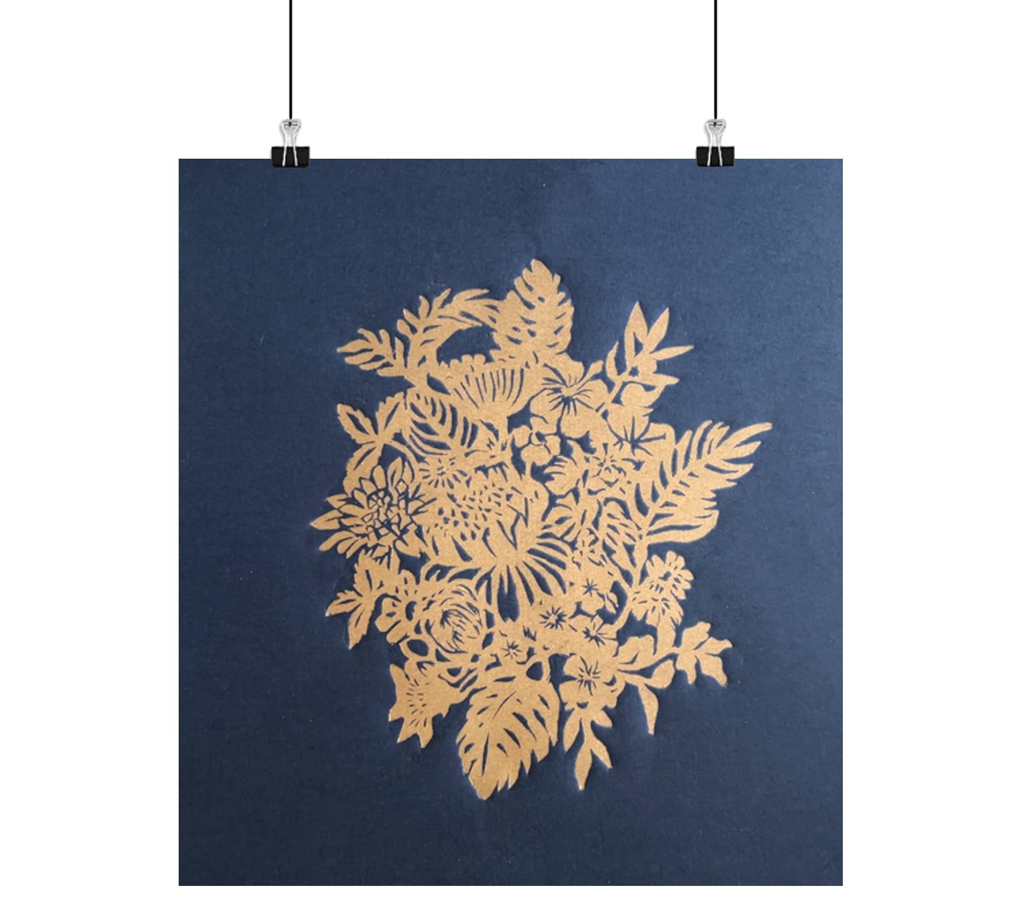 Unika linoleumstryk af blomster i str. ca. 30x40 cm Papiret er indigo blå japansk papir med guld motiv Serien er trykt i 8 eksemplarer, som alle er nummeret og signeret.